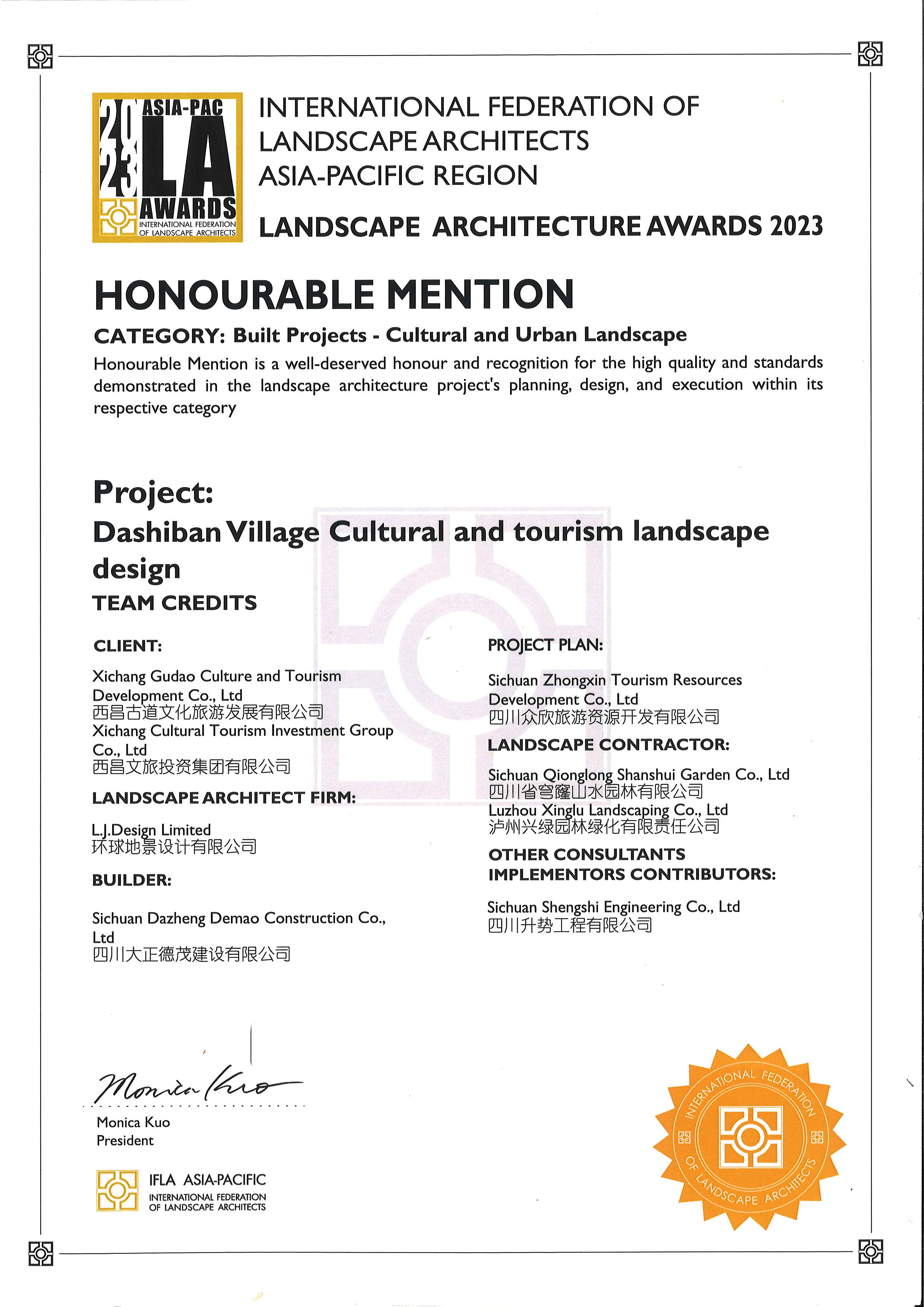 近日,全球風(fēng)景園林最高獎之一——國際風(fēng)景園林師聯(lián)合會(IFLA)正式公布2023年亞太區(qū)風(fēng)景園林國際大獎(LANDSCAPE ARCHITECTURE AWARDS 2023)評選結(jié)果,瀘州城投集團(tuán)興綠園林公司負(fù)責(zé)實施的園林景觀部分設(shè)計和施工的《西昌市海南街道大石板鄉(xiāng)村振興二期基礎(chǔ)設(shè)施建設(shè)項目》從全球眾多實力參賽作品中脫穎而出,斬獲2023IFLA景觀建筑榮譽獎。