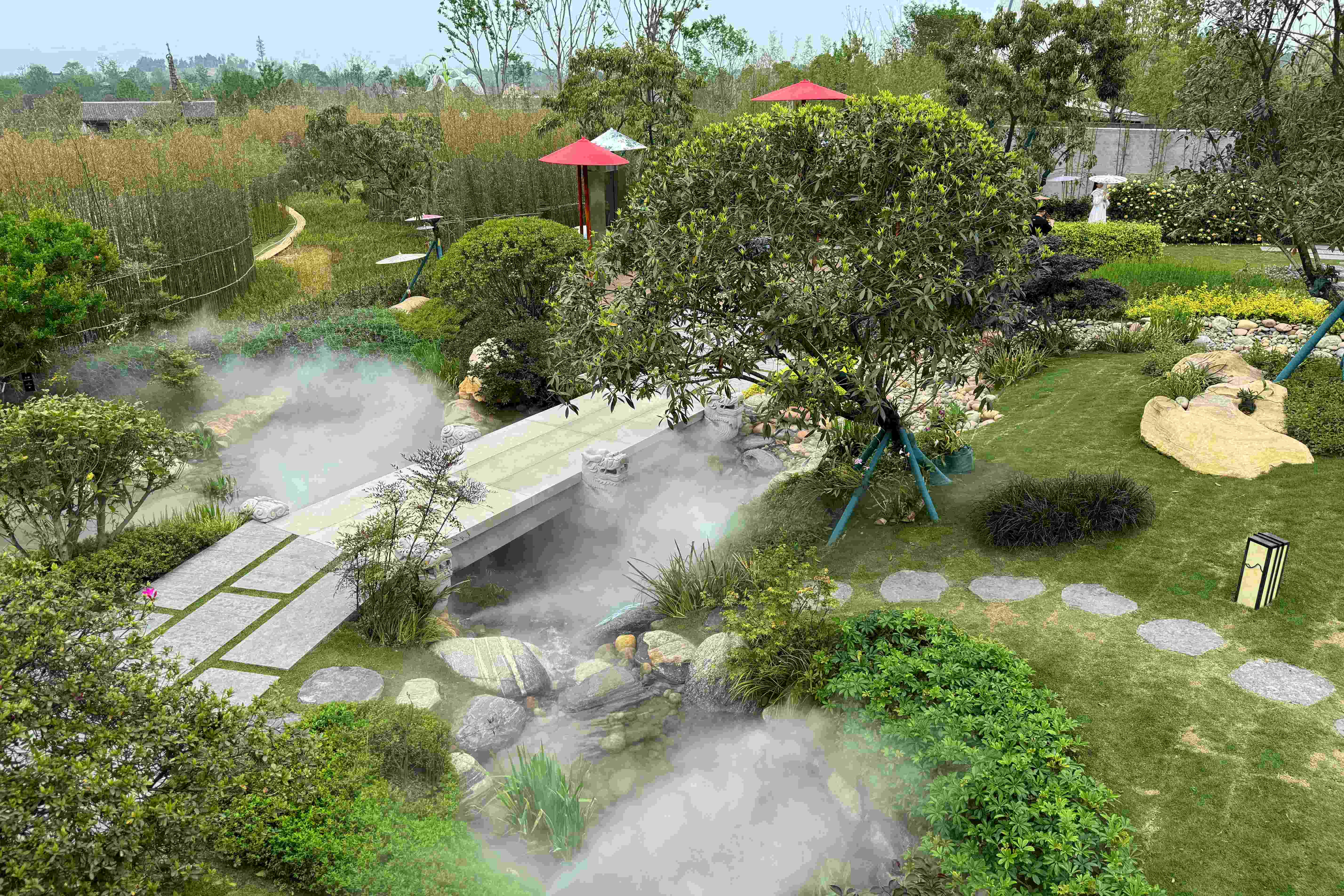 全園植物造景以雅致為特色,形態(tài)古樸,品種選取瀘州市花桂花、市樹桂圓,及曾唯一入選北京奧運(yùn)的荔枝品牌“帶綠”,還有蘭花、金釵石斛等體現(xiàn)瀘州特色,并通過(guò)綠植、奇石相互輝映講述瀘州的山石之美與豪邁熱情。以瀘州非物質(zhì)文化遺產(chǎn)分水油紙傘為靈感設(shè)計(jì)創(chuàng)意構(gòu)筑,與新型光電技術(shù)互動(dòng)光影屏相依而立,展現(xiàn)了古與今的對(duì)話,實(shí)與虛的結(jié)合,充分展示酒城工匠的作品與藝術(shù)造詣。