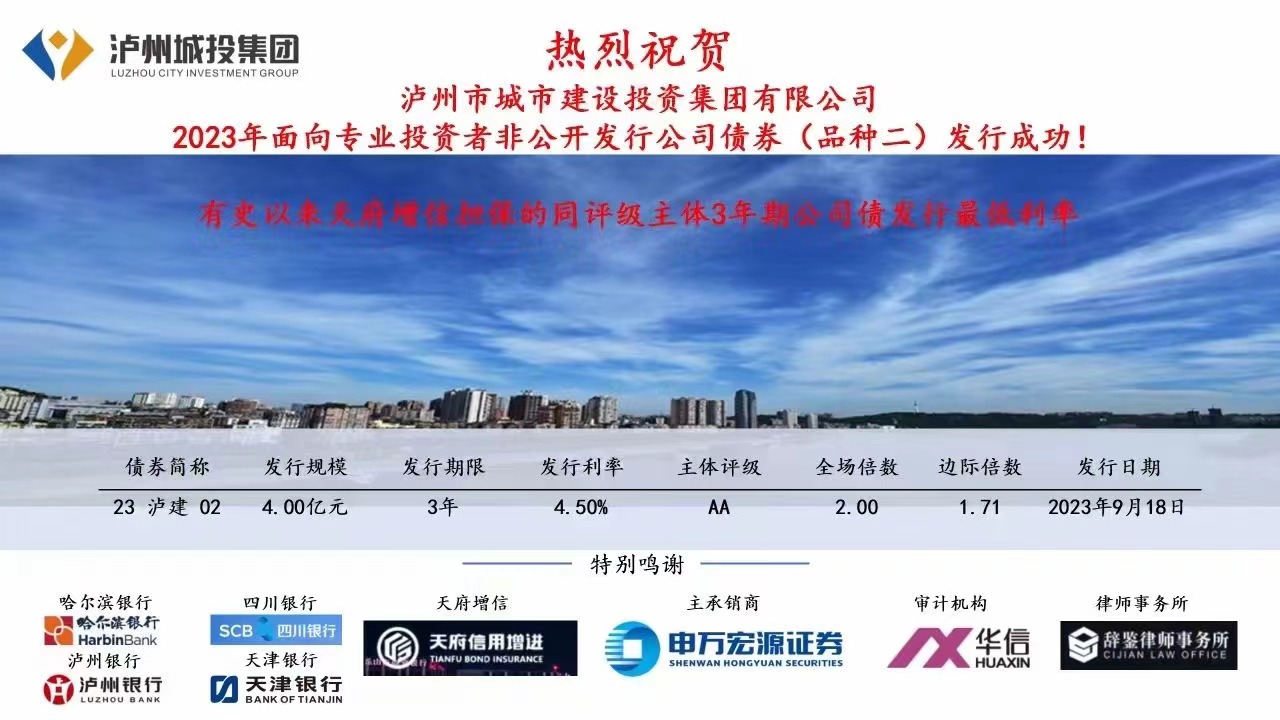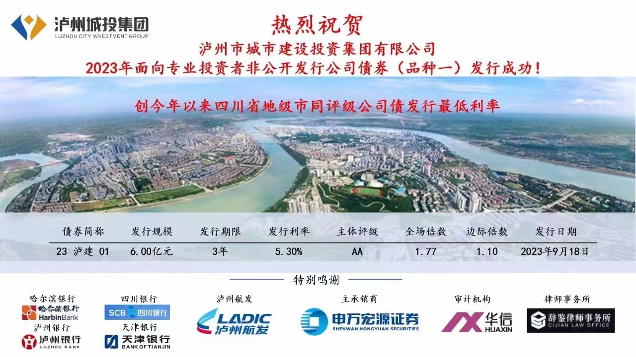 9月18日,瀘州市城市建設(shè)投資集團(tuán)有限公司(以下簡(jiǎn)稱(chēng)城投集團(tuán))2023年非公開(kāi)發(fā)行公司債成功發(fā)行,債券規(guī)模10億元,得到了哈爾濱銀行、四川銀行、瀘州銀行、天津銀行以及各類(lèi)券商、信托等非銀機(jī)構(gòu)投資人的關(guān)注和參與。
