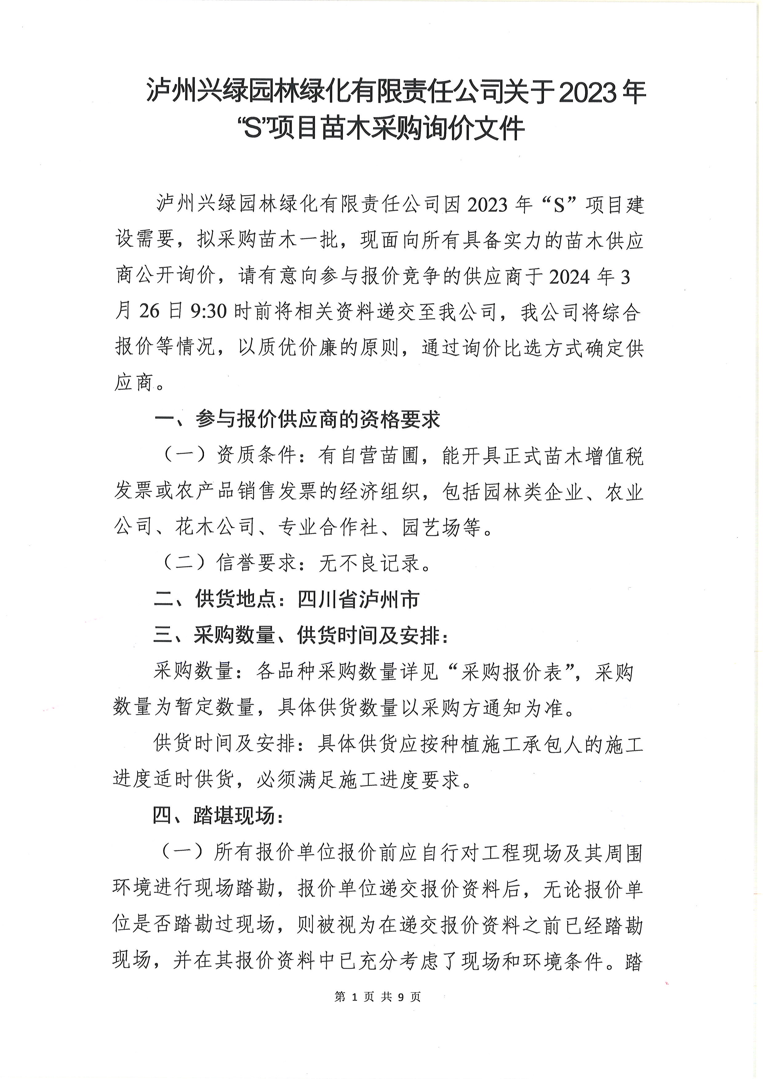 2023年“S”項(xiàng)目苗木采購(gòu)詢價(jià)公告