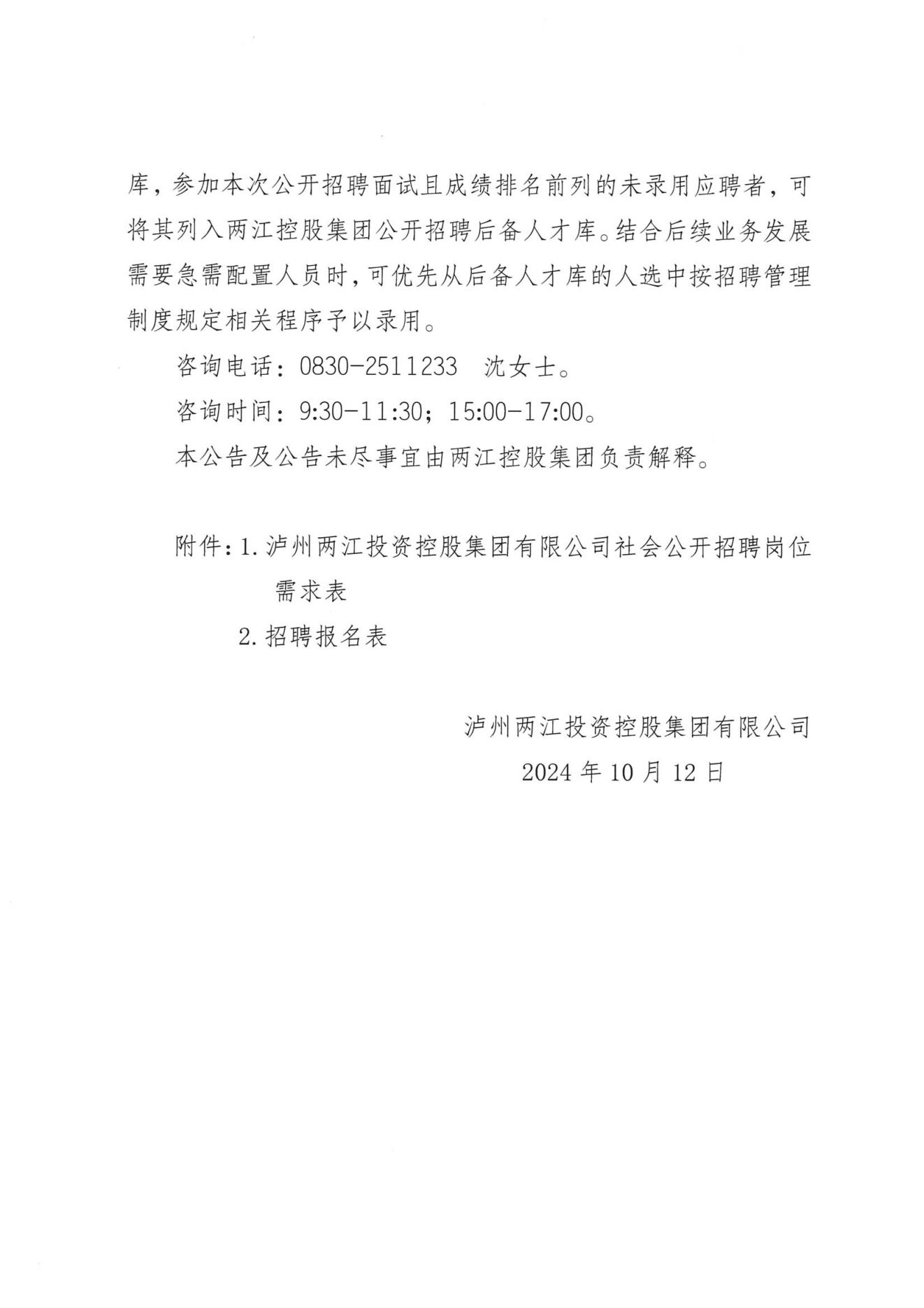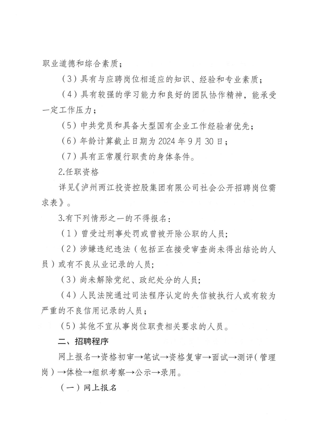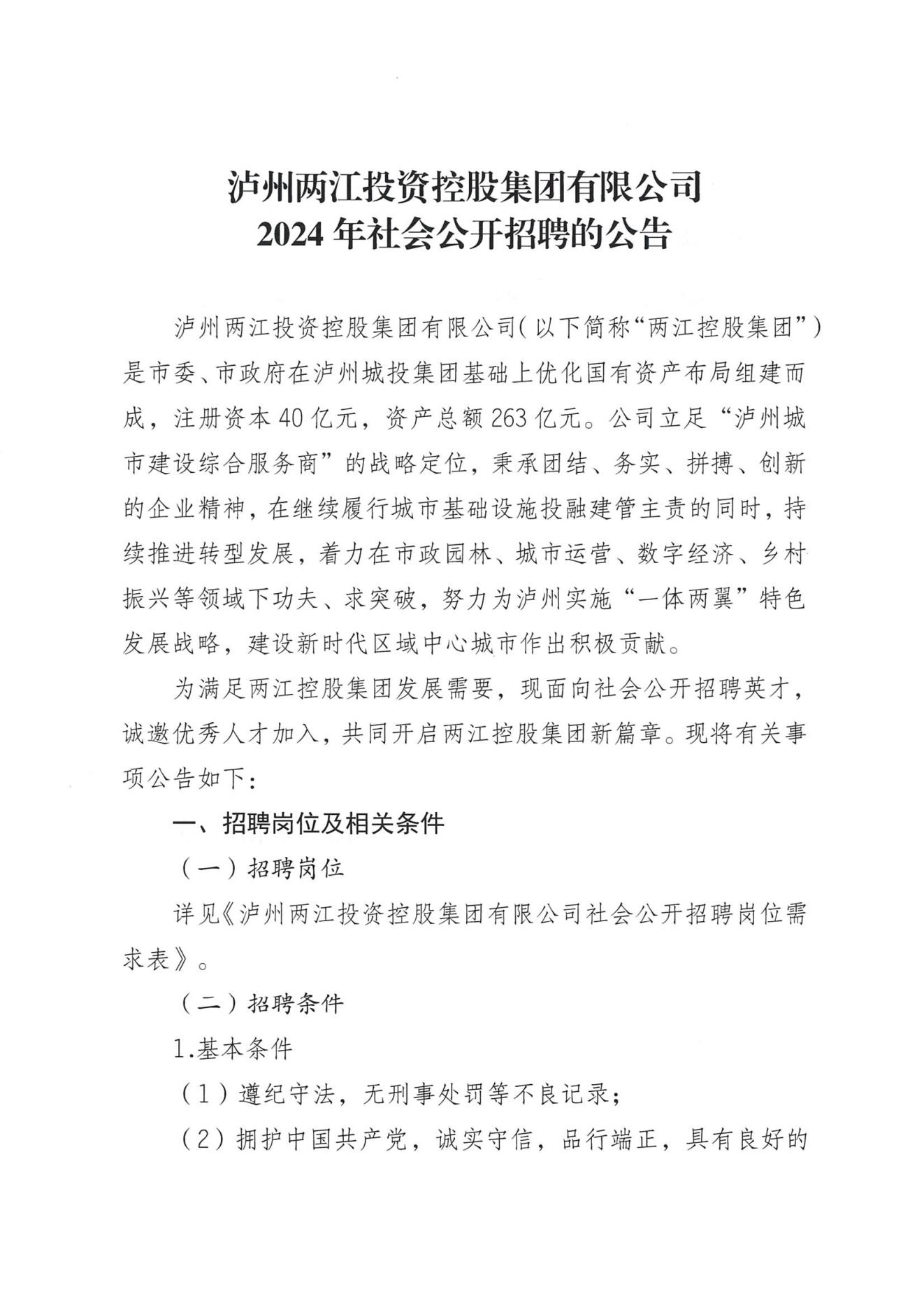 瀘州兩江投資控股集團(tuán)有限公司及其下屬子公司2024年社會(huì)公開招聘的公告